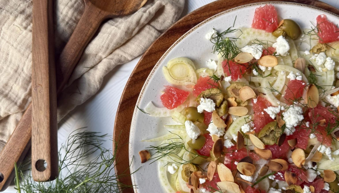 • Ajouter le pamplemousse, les olives, le fêta et les amandes.